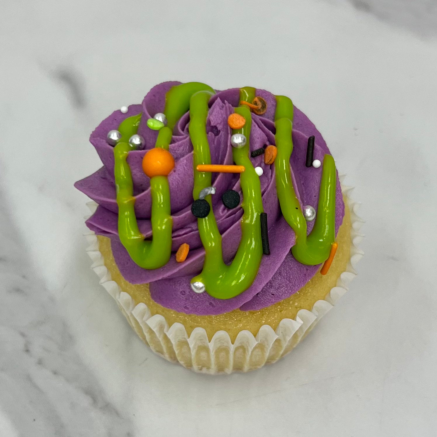 A vanilla cupcake with purple vanilla buttercream topped with a white choc green slime!